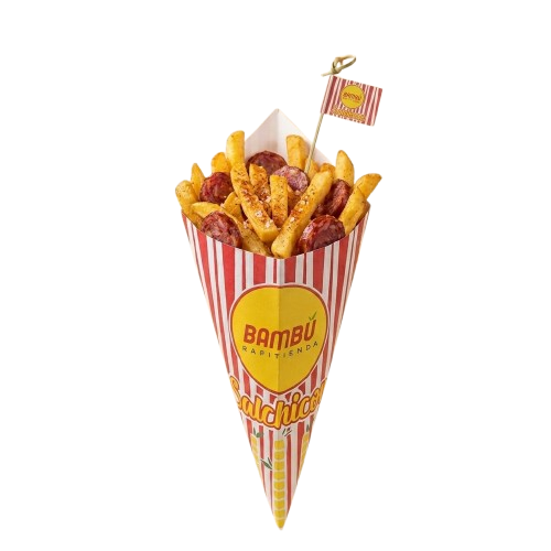 “Cono” (papas + salchicha + pollo broaster + cremas).